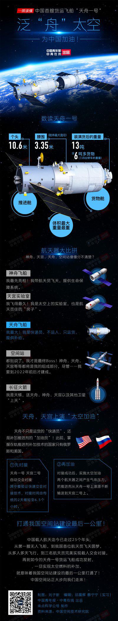 天舟一号则可以落到南太平洋的指定区域,既避免离轨过程中的不可控因素,也将为打造洁净、安全的太空环境作出自己的贡献。